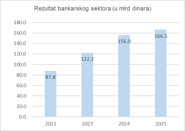 Bankarski sektor Srbije je u 2025 ostvario dobit od 166,5 milijardi dinara (1,42 milijarde evra) čime je ostvario rast pozitivnog rezultata od 6,74% u odnosu na prethodnu godinu (2024: 156,0 milijardi dinara odnosno 1,33 milijarde evra).